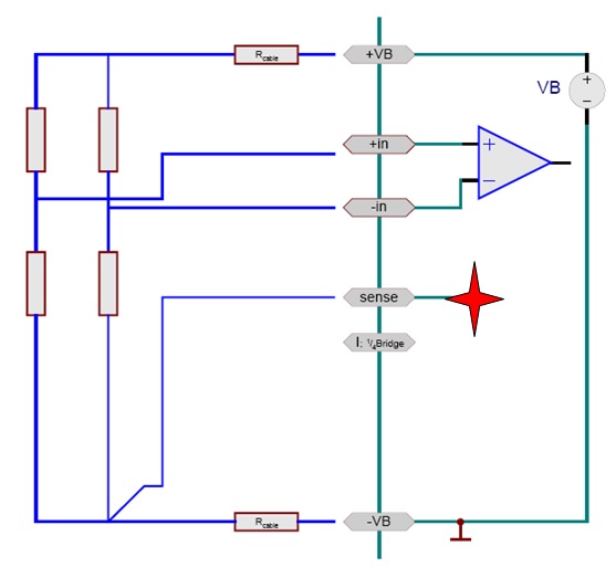 桥路测量通过“Sense”的端子,可以敏感捕捉线阻造成的电压降。而这种电压降会造成测量结果的错误。Sense端可以把电压降反馈给系统,使系统适当提高激励电压,修正桥路输出。