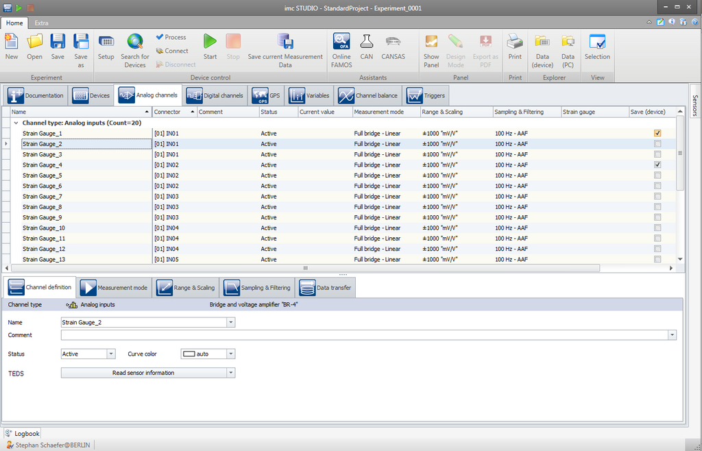 imc STUDIO Setup se utiliza para la configuración completa de su proyecto de medición. Una pantalla tabular le ofrece una visión general rápida y estructurada de su configuración. Las funciones de clasificación y filtrado también ayudan a realizar un seguimiento de muchos canales. Al mismo tiempo, puede adaptar intuitivamente la pantalla a sus necesidades en cualquier momento y así ocultar o resumir parámetros, almacenar configuraciones fijas o agregar sus propios parámetros. Las celdas de la tabla muestran claramente los parámetros de configuración seleccionados actualmente y ofrecen un menú emergente adecuado para seleccionar las posibles opciones cuando hace clic directamente.