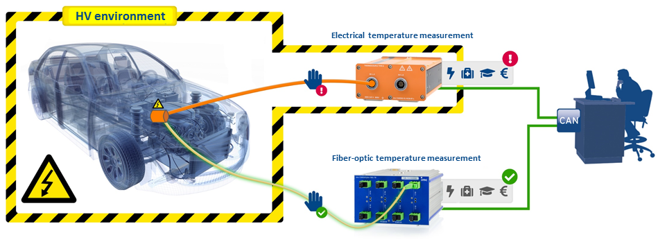 Les utilisateurs effectuant des mesures dans des environnements sous haute tension ou dans le domaine de l'électro-mobilité bénéficient tout particulièrement de la robustesse de la technologie de la fibre optique. Grâce au principe de mesure optique, cette technologie est insensible aux interférences électrostatiques et électromagnétiques, ce qui est souvent un problème lors de l'utilisation de la technologie de mesure classique dans des environnements sous haute tension.