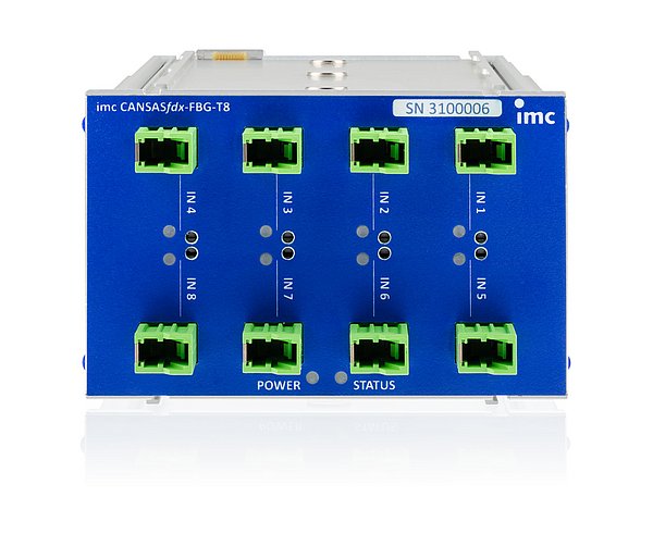 Le nouveau module de mesure CAN à fibre optique imc CANSAS-FBG-T8 rend les essais dans les environnements haute tension plus sûrs et plus faciles. Grâce au mode de fonctionnement optique, le point de mesure et l'appareil sont entièrement dissociés. Grâce à huit entrées optiques, le module peut mesurer des températures à des valeurs électriques quelconques à l'aide de capteurs spécialement développés avec la technologie des réseaux de Bragg sur fibre optique (FBG). La sortie des données s'effectue via CAN.