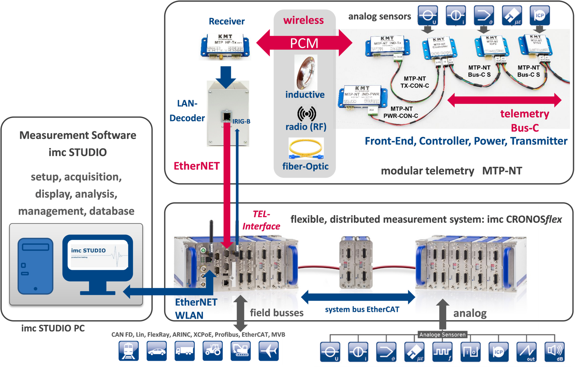Indépendamment de la technique de transmission choisie, le flux de données PCM codé en série est décodé du côté du récepteur et converti en format numérique. Cette sortie numérique est la plus souple et la plus efficace pour l'intégration dans un système de mesure. Dans ce cas, une interface réseau et un protocole Ethernet standard sont les mieux adaptés. Tous les systèmes de mesure imc peuvent être complétés par une telle interface de télémétrie. Un concept particulièrement modulaire et flexible peut être réalisé en combinant le système de mesure CRONOSflex imc avec la télémétrie MTP (voir figure 1).