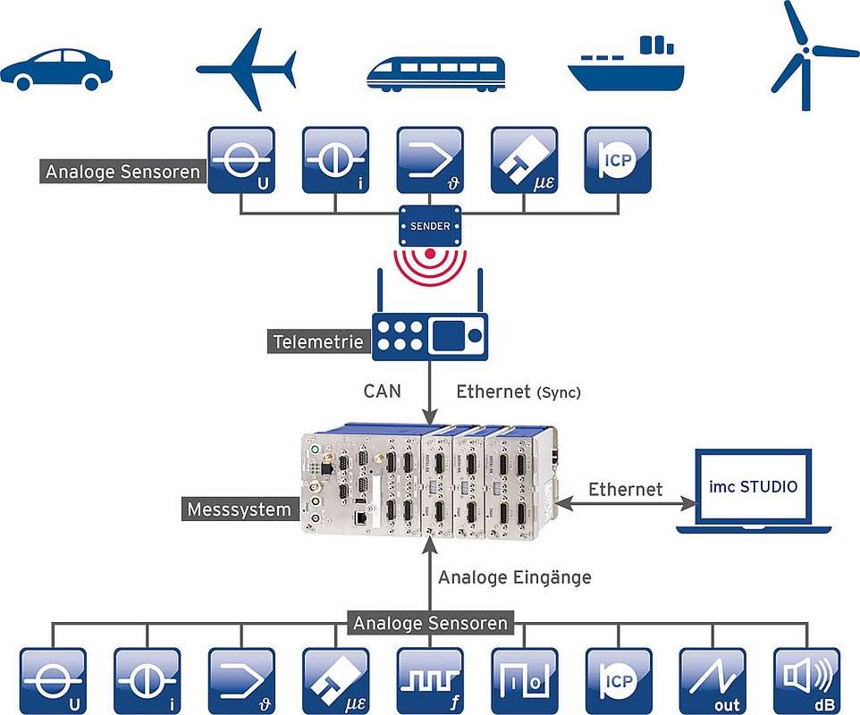 Járművek, szélgenerátorok és gépek teljeskörű tesztjeihez gyarkran szükséges a telemetriával gyűjtött adatok mellett kiegészítő változók mérése is. Telemetria rendszereink közvetlenül csatlakoztathatóak imc mérésadatgyűjtő rendszerekhez. Ezel az adatgyűjtők számost mérőmodult kínálnak a különböző érzékelőkhöz és jeltípusokhoz, illetve interfészeket különböző terepi buszokhoz. Az adatgyűjtők képesek ezekből a forrásokból érkező adatok szinkronizálására és azokkal valósidejű számításokat végzésére. Az eredmények különböző hálózati interfészek segítségével továbbíthatóak egy magasabb szintű rendszernek, mint például egy vezérlő vagy egy cloud alapú adatbázis.