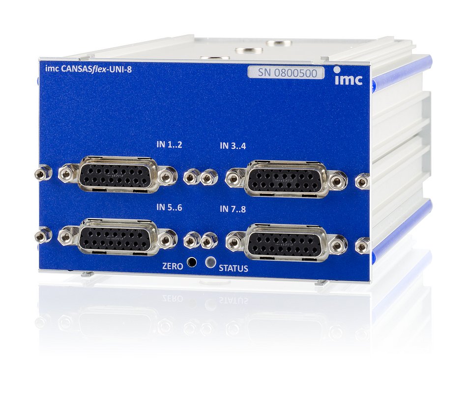 The imc CANSAS-UNI8 module provides 8 versatile all-purpose channels which are individually filtered, amplified and digitized. In this way, imc CANSAS-UNI8 covers a wide range of physical measurement applications, from temperatures to current and voltage, all the way to acquisition of measurement bridge and strain gauge signals.