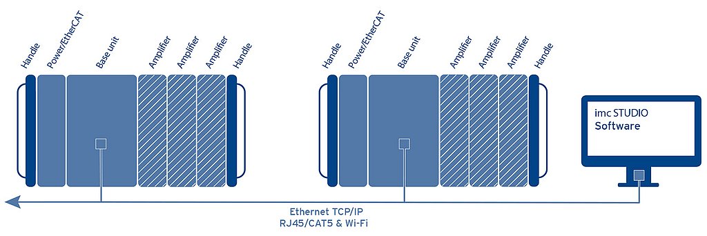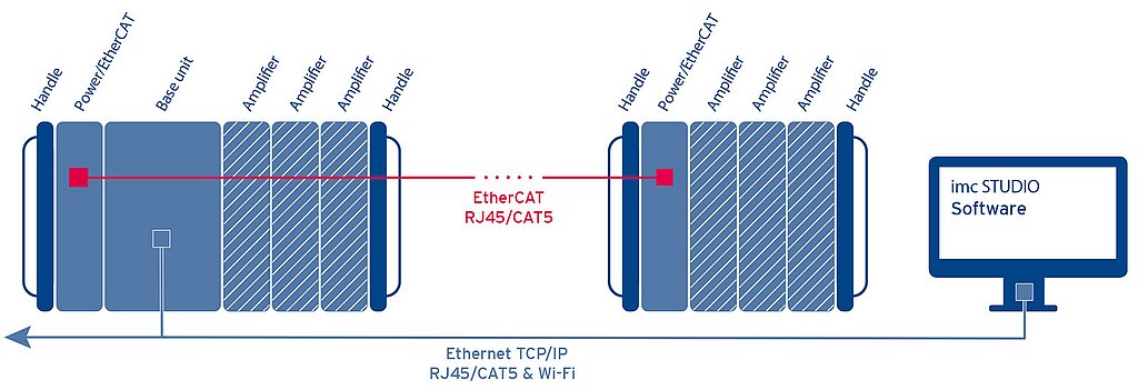 In addition to the modular design as a centralized system, imc CRONOS-XT can also be installed in a spatially distributed topology. This allows measurement amplifiers to be placed close to the sensor in order to keep the length of sensitive and expensive cables to a minimum. Networking is accomplished via the EtherCAT-based imc system bus. All data converge synchronously in the base unit.