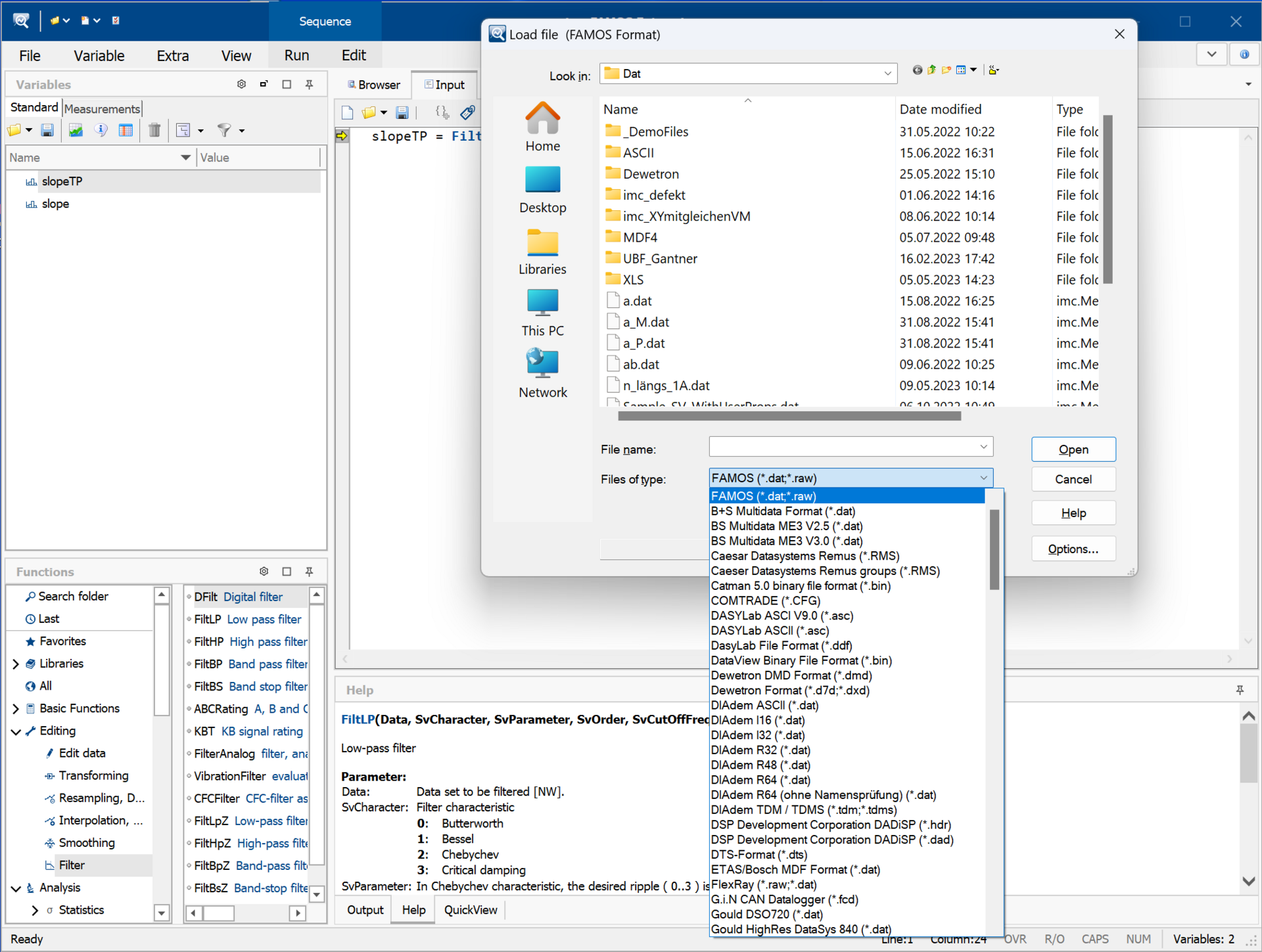 imc FAMOS supports a large number of common file formats such as MDF, CSV, Excel, WAV, Matlab and many more. Numerous file import filters allow a direct import of different formats without losing precision or metadata like units and time stamps.