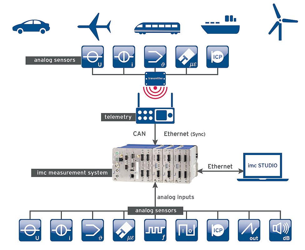 For holistic testing on vehicles, wind turbines and machinery it is often necessary to acquire additional measurement variables in addition to the telemetry data. The telemetry solutions allow for a direct connection to imc measurement systems. These instruments provide measurement modules as well as interfaces to typical process and fieldbus systems for all common signals and sensors. The imc system collects and synchronizes these multi-domain data and allows for further processing and analyzing in real time.