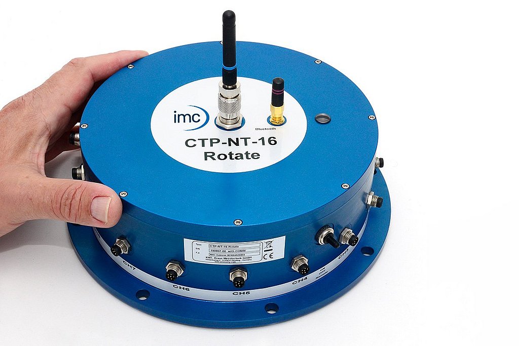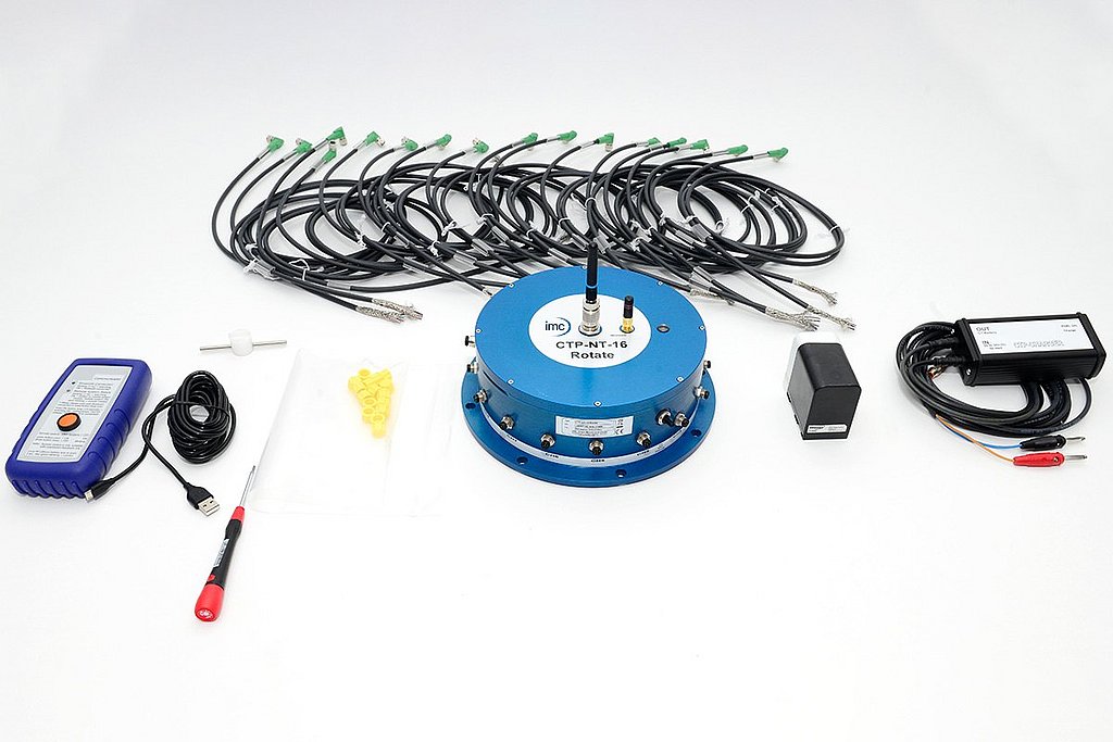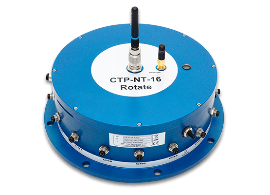 The CTP-NT-Rotate telemetry system enables the acquisition, processing and transmission of 8, 16, 32 or 64 parallel measurement signals from rotating machinery, test benches, wheels and rotors. Various configurations of different sensor modules are available incl. signal conditioning for strain gages (STG), thermocouples type K (TH-K), ICP sensors, potentiometer sensors (POT), LVDT / RVDT sensors and also voltage inputs. Mixed configuration available (2-CH-steps). The integrated accumulator unit allows easy and quick installation of telemetry. The weatherproof system designed for outdoor use (IP65) enables data transmission over distances of up to 20 meters in free fields.