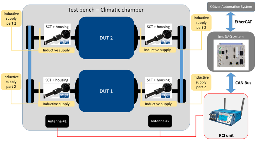 A technically advanced, yet simple data acquisition solution is to use a wireless telemetric torque and speed measuring system. It is embedded in a compact shaft housing that can be easily mounted on the axle of any test specimen. The transmitter unit is powered by an induction coil.