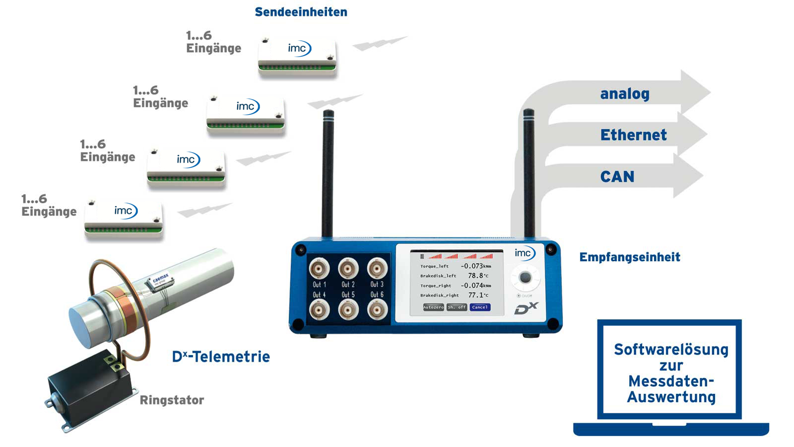 One data acquisition solution to improve the performance of a PMSM and to develop it in a thermally safe manner is to use telemetric data acquisition, as measurements are made on the test bench during the endurance test on the running rotor. imc offers the universal Dx telemetry for data acquisition on rotating parts. This is a very compact and lightweight multi-channel telemetry system. Thanks to the universal transmitter module, it can be used flexibly and allows wireless measurements with different numbers of channels and sensor assignments. Up to four transmitters can be operated synchronously with one receiver, allowing simultaneous acquisition of spatially distributed measurement points.